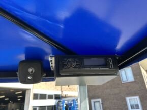 - Radio met boven iedere stoel een box.